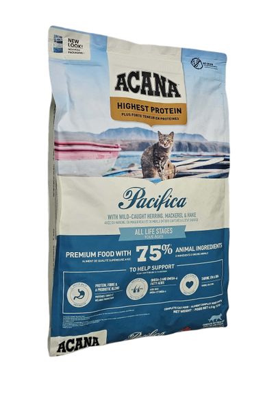 Aus 75% tierischen Zutaten wie Hering, Makrele, Hecht, Wittling, Flunder, Rotbarsch und 25% Früchten und Gemüse zubereitet: Das neue Acana Pacifica Cat & Kitten ist biologisch angemessenes Alleinfutter für Katzen aller Rassen und Lebensphasen. Das Katzenfutter in der neuen Rezeptur enthält jetzt noch mehr Fischzutaten. Voller frischer Fischsorten des Pazifiks und der kalten kanadischen Gewässer, erhalten Sie Acana Pacifica Cat in der wieder verschließbaren 4,5kg Frischepackung. Acana Pacifica Cat ist die biologisch angemessene Katzennahrung aus frischen regionalen Zutaten. Alle Zutaten der kanadischen Trockennahrung kommen aus der kanadischen Region. Täglich gelangen Hering, Makrele, Hecht, Wittling, Flunder & Rotbarsch frisch in die Acana-Küchen. Dies garantiert den vollen Geschmack und die Qualität, um Ihre Katze rundum zu ernähren. Skipper John aus Port Hardy, North Vancouver Island ist vertrauter Lieferant von frischen, wild gefangenen Salzwasserfischen. Aus dem Okanagan-Tal und dem Faser-Tal (British Columbia) kommen Obst und Gemüse wie frische Karotten und frische Äpfel. Der Acana Hersteller Champion Petfoods ist selbst Küchenchef und bereitet echtes Futter in den eigenen Küchen. In Alberta, Kanada, werden die frischen Zutaten im eigenen Saft schonend dampf gegart. Hier bleibt jeder Zubereitungsschritt in der eigenen Hand. Denn Qualität lässt sich nicht auslagern. Als Karnivore ist Ihre Katze angepasst an eine reichhaltige Nahrung voller Fleisch, mit tierischen Proteine und Fetten. Dieser Tatsache Rechnung tragend, enthält das neue Acana Pacifica Cat & Kitten kaum Kohlenhydrate, kein hochglykämisches Getreide und keine Kartoffeln. Für eine intensiven natürlichen Geschmack jetzt mit gefriergetrockneter Kabeljauleber. Energielieferanten: Energieverteilung des Futters Metabolisierbare Energie: Acana Pacifica Cat: die neuen Zutaten der biologisch angemessenen Katzennahrung aus frischen regionalen Zutaten Kanadas, gegart im eigenem Saft (ohne Zugabe von Wasser) im Einzelnen (größter Anteil zuerst): Acana ist OHNE : kein BHA, kein BHT, kein Ethoxyquin zugesetzt. Champion Petfoods empfiehlt für Kitten und Katzen: Ihre Kitten bzw. Katze ist ein einzigartiges Individuum – so wie Sie. Der Futterbedarf variiert je nach Rasse, Umfeld, Alter und Aktivität. Daher empfehlen wir, die Fütterungstabelle als ersten Anhaltspunkt heranzuziehen: Beobachten Sie das Gewicht Ihrer Katze und passen Sie die Fütterungsmenge individuell an. Wir empfehlen ferner, zwei Mal täglich zu füttern und stets frisches Wasser bereitzustellen. Bei einer Futterumstellung ist es wichtig, eine Übergangsphase einzuführen, da Ihre Kitten bzw. Katze etwas Zeit braucht, um ihr Verdauungssystem einzustellen auf diese reichhaltigere, nahrhaftere ACANA-Nahrung. Über einen Zeitraum von 5 – 7 Tagen, mischen Sie schrittweise mit ACANA. Erhöhen Sie die Menge täglich, sodass Sie an Tag 7 100% ACANA füttern. Fütterungsempfehlung für Kätzchen: Bitte denken Sie daran, dass Katzen wie Menschen sind und unterschiedliche Katzen einen unterschiedlichen Appetit haben. Die Fütterungstabelle gibt Durchschnittswerte für durchschnittliche Gewichtsgruppen an. Die Erscheinung und Aktivitäten Ihres Tieres helfen Ihnen dabei, den individuellen Futterbedarf zu bestimmen. Es ist zur Schonung des Magens ratsam, die Tagesration auf zwei Tages-Mahlzeiten zu verteilen. AAFCO: Acana Pacifica Cat entspricht den Nährwertprofilen der AAFCO (Nährstoffprofile Katzenfutter) für ALLE LEBENSPHASEN (Wachstum, Erwachsenen-Alter, Säuge- und Stillzeit, Senior-Alter). Acana wird aus frischen, natürlichen Zutaten zubereitet (ist ein Naturprodukt): Form und Farbe der Kroketten können variieren.Acana Pacifica Katzenfutter: authentisch und regional