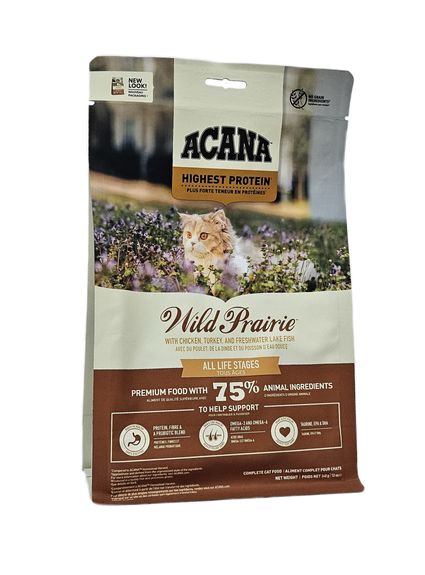 Das neue Acana Wild Prairie Cat & Kitten Katzenfutter für Kitten und Katzen in der praktischen 340g Probierpackung, enthält viel Fleisch und noch mehr frische Zutaten von Huhn, Truthahn, Regenbogenforelle, Felchen und Hering. Dieses Acana für Katzen beinhaltet zusätzlich gefriergetrocknete Fleischquellen einschließlich Leber vom Huhn und Truthahn! Das biologisch angemessene Katzenfutter enthält kein Getreide und keine Kartoffeln. Ohne künstliche Zutaten, ohne Genmanipulation. FÜR CARNIVOREN ENTWORFEN Unsere neues biologisch angemessenes Wild Prairie Cat ist so konzipiert, dass sie die Ernährungsanatomie der Stubentiger abdeckt und eine natürliche, artgerechte Ernährung widerspiegelt - wir haben ACANA Wild Prairie Cat mit vielen nährenden Proteinen und Fetten in der neuen Rezeptur entwickelt , wodurch unerwünschte Kohlenhydrate begrenzt werden konnten. Nicht nur mehr frisches Fleisch, neue Verpackung & Größe! Acana Wild Prairie Cat & Kitten beinhaltet noch mehr Fleisch. Mit 75% Fleisch entspricht Acana dem, was Ihre Kitten oder Katze von Natur aus bevorzugt. Mit neuen Fleischzutaten: Jetzt enthält Acana Wild Prairie Cat & Kitten Truthahn, Leber, Herz, Hering, Felchen, Regenbogenforelle neben Huhn und frischen Nesteiern. Mit gefriergetrockneten Zutaten: Leber von Huhn & Truthahn sind Teil des neuen Trockenfutters für Katzen. Das neue Acana Wild Prairie für Katzen geht ein auf die evolutionsbedingte Anpassung an fleisch- und proteinreiche Kost. Ohne Getreide, ohne Kartoffel Weder Kartoffel noch Süßkartoffel sind Bestandteil der neuen Acana Rezeptur. Übergewicht und Diabetes werden mit hochglykämischen Kohlenhydraten in Verbindung gebracht. Kohlenhydrate mit hohem Glyx-Index werden schnell verdaut und verursachen einen rapiden und großen Anstieg des Blutzuckerspiegels von Katzen. Niedrigglykämisch und mit wenigen Kohlenhydraten hält Acana Wild Prairie Ihre Katze jeden Alters gesund, fit und glücklich. Noch frischer & mit neuen Obst- und Gemüsesorten Frische ganze Früchte und neue Zutaten wie rote Linsen, Kürbis, Äpfel, frische ganze Cranberries, frische ganze Heidelbeeren und Birnen sorgen für eine ausgezeichnete Gesundheit und stärken das Immunsystem. Mit neuen Heilpflanzen wie Chicoréewurzel, Mariendistel, Kurkuma, Hagebutte sowie brauner Seetang Lavendel und Eibischwurzel, zur Anregung des Stoffwechsels und zur Unterstützung der Verdauung. Haben Sie die bisherige Rezeptur von Acana Wild Prairie Cat & Kitten oder eine andere Acana Katzennahrung gefüttert, müssen Sie keine Umstellungsphase berücksichtigen! Obst, Gemüse z.B.: frische Cranberries, frische Heidelbeeren, frische Äpfel und Birnen, einschließlich Heilkräuter & Vitamine, Mineralien, Energielieferanten: Energieverteilung des Futters Metabolisierbare Energie: Acana Wild Prairie Cat Die neuen Zutaten der biologisch angemessenen Katzennahrung aus frischen regionalen Zutaten Kanadas, gegart im eigenem Saft (ohne Zugabe von Wasser) im Einzelnen (größter Anteil zuerst): Champion Petfoods empfiehlt für Kitten und Katzen: Ihre Kitten bzw. Katze ist ein einzigartiges Individuum – so wie Sie. Der Futterbedarf variiert je nach Rasse, Umfeld, Alter und Aktivität. Daher empfehlen wir, die Fütterungstabelle als ersten Anhaltspunkt heranzuziehen: Beobachten Sie das Gewicht Ihrer Katze und passen Sie die Fütterungsmenge individuell an. Wir empfehlen ferner, zwei Mal täglich zu füttern und stets frisches Wasser bereitzustellen. Bei einer Futterumstellung ist es wichtig, eine Übergangsphase einzuführen, da Ihre Kitten bzw. Katze etwas Zeit braucht, um ihr Verdauungssystem einzustellen auf diese reichhaltigere, nahrhaftere ACANA-Nahrung. Über einen Zeitraum von 5 – 7 Tagen, mischen Sie schrittweise mit ACANA. Erhöhen Sie die Menge täglich, sodass Sie an Tag 7 100% ACANA füttern. Fütterungsmenge für Kätzchen: Bitte denken Sie daran, dass Katzen wie Menschen sind und unterschiedliche Katzen einen unterschiedlichen Appetit haben. Die Fütterungstabelle gibt Durchschnittswerte für durchschnittliche Gewichtsgruppen an. Die Erscheinung und Aktivitäten Ihres Tieres helfen Ihnen dabei, den individuellen Futterbedarf zu bestimmen. Es ist zur Schonung des Magens ratsam, die Tagesration auf zwei Tages-Mahlzeiten zu verteilen. AAFCO: Acana Wild Prairie Cat entspricht den Nährwertprofilen der AAFCO (Nährstoffprofile Katzenfutter) für ALLE LEBENSPHASEN (Wachstum, Erwachsenen-Alter, Säuge- und Stillzeit, Senior-Alter). Acana wird aus frischen, natürlichen Zutaten zubereitet (ist ein Naturprodukt): Form und Farbe der Kroketten können variieren. Überblick