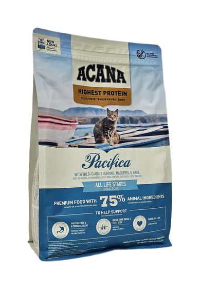 Aus 75% tierischen Zutaten wie Hering, Makrele, Hecht, Wittling, Flunder, Rotbarsch und 25% Früchten und Gemüse zubereitet: Das neue Acana Pacifica Cat & Kitten ist biologisch angemessenes Alleinfutter für Katzen aller Rassen und Lebensphasen. Das Katzenfutter in der neuen Rezeptur enthält jetzt noch mehr Fischzutaten. Voller frischer Fischsorten des Pazifiks und der kalten kanadischen Gewässer, erhalten Sie Acana Pacifica Cat in der wieder verschließbaren 1,8kg Frischepackung. Acana Pacifica Cat ist die biologisch angemessene Katzennahrung aus frischen regionalen Zutaten. Alle Zutaten der kanadischen Trockennahrung kommen aus der kanadischen Region. Täglich gelangen Hering, Makrele, Hecht, Wittling, Flunder & Rotbarsch frisch in die Acana-Küchen. Dies garantiert den vollen Geschmack und die Qualität, um Ihre Katze rundum zu ernähren. Skipper John aus Port Hardy, North Vancouver Island ist vertrauter Lieferant von frischen, wild gefangenen Salzwasserfischen. Aus dem Okanagan-Tal und dem Faser-Tal (British Columbia) kommen Obst und Gemüse wie frische Karotten und frische Äpfel. Der Acana Hersteller Champion Petfoods ist selbst Küchenchef und bereitet echtes Futter in den eigenen Küchen. In Alberta, Kanada, werden die frischen Zutaten im eigenen Saft schonend dampf gegart. Hier bleibt jeder Zubereitungsschritt in der eigenen Hand. Denn Qualität lässt sich nicht auslagern. Als Karnivore ist Ihre Katze angepasst an eine reichhaltige Nahrung voller Fleisch, mit tierischen Proteine und Fetten. Dieser Tatsache Rechnung tragend, enthält das neue Acana Pacifica Cat & Kitten kaum Kohlenhydrate, kein hochglykämisches Getreide und keine Kartoffeln. Für eine intensiven natürlichen Geschmack jetzt mit gefriergetrockneter Kabeljauleber. Energielieferanten: Energieverteilung des Futters Metabolisierbare Energie: Acana Pacifica Cat: die neuen Zutaten der biologisch angemessenen Katzennahrung aus frischen regionalen Zutaten Kanadas, gegart im eigenem Saft (ohne Zugabe von Wasser) im Einzelnen (größter Anteil zuerst): Acana ist OHNE : kein BHA, kein BHT, kein Ethoxyquin zugesetzt. Champion Petfoods empfiehlt für Kitten und Katzen: Ihre Kitten bzw. Katze ist ein einzigartiges Individuum – so wie Sie. Der Futterbedarf variiert je nach Rasse, Umfeld, Alter und Aktivität. Daher empfehlen wir, die Fütterungstabelle als ersten Anhaltspunkt heranzuziehen: Beobachten Sie das Gewicht Ihrer Katze und passen Sie die Fütterungsmenge individuell an. Wir empfehlen ferner, zwei Mal täglich zu füttern und stets frisches Wasser bereitzustellen. Bei einer Futterumstellung ist es wichtig, eine Übergangsphase einzuführen, da Ihre Kitten bzw. Katze etwas Zeit braucht, um ihr Verdauungssystem einzustellen auf diese reichhaltigere, nahrhaftere ACANA-Nahrung. Über einen Zeitraum von 5 – 7 Tagen, mischen Sie schrittweise mit ACANA. Erhöhen Sie die Menge täglich, sodass Sie an Tag 7 100% ACANA füttern. Fütterungsempfehlung für Kätzchen: Bitte denken Sie daran, dass Katzen wie Menschen sind und unterschiedliche Katzen einen unterschiedlichen Appetit haben. Die Fütterungstabelle gibt Durchschnittswerte für durchschnittliche Gewichtsgruppen an. Die Erscheinung und Aktivitäten Ihres Tieres helfen Ihnen dabei, den individuellen Futterbedarf zu bestimmen. Es ist zur Schonung des Magens ratsam, die Tagesration auf zwei Tages-Mahlzeiten zu verteilen. AAFCO: Acana Pacifica Cat entspricht den Nährwertprofilen der AAFCO (Nährstoffprofile Katzenfutter) für ALLE LEBENSPHASEN (Wachstum, Erwachsenen-Alter, Säuge- und Stillzeit, Senior-Alter). Acana wird aus frischen, natürlichen Zutaten zubereitet (ist ein Naturprodukt): Form und Farbe der Kroketten können variieren.Acana Pacifica Katzenfutter: authentisch und regional